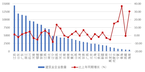 图3 2025 年上半年各地区建筑业企业数量及其增长情况