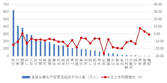 图4 2025 年上半年各地区直接从事生产经营活动的平均人数及其增长情况