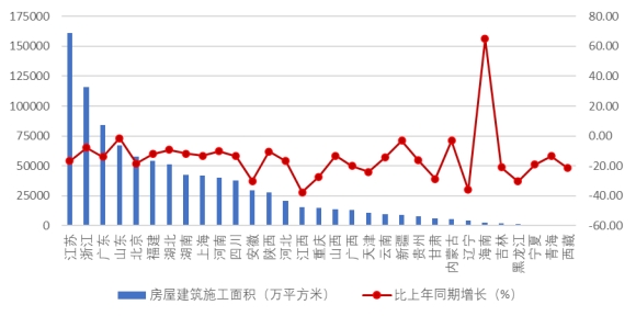 2025 年上半年,江苏、浙江建筑业企业房屋建筑施工面积均超过10亿平方米,分别为16.09亿平方米、11.57亿平方米。房屋建筑施工面积超过 5亿平方米的还有广东、山东、北京、福建、湖北等5个地区。海南房屋建筑施工面积同比增长了65.01%,其余30个地区房屋建筑施工面积均为负增长,其中江西、辽宁、黑龙江、安徽的负增长均超过30%,甘肃、重庆、天津、西藏、吉林、广西的负增长均超过20%(图8)。